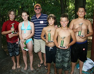 OTCC board member Brian Petitt (third from left) congratulates the winners of this year's Youth Fishing Tournament. From left: Kyle Neill, longest fish; Kelley Hamilton, first place; Matt Neill, second place; Tyler Davis, third place; Charlie Comeaux, most fish. |